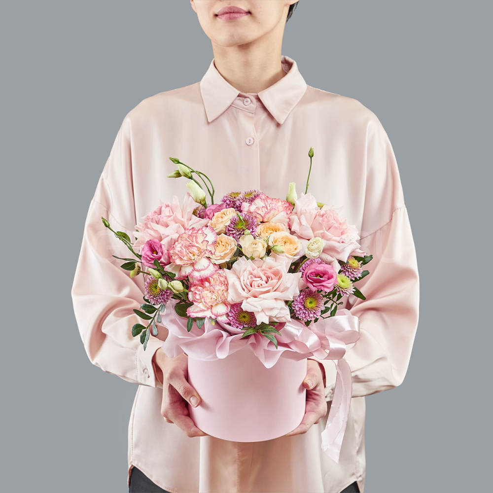 Нежная цветочная композиция из роз, гвоздик и эустомы в шляпной коробке