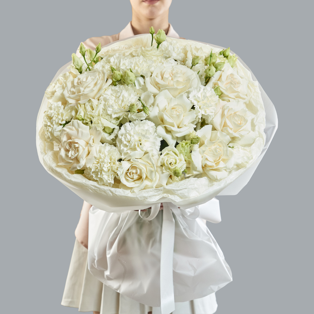 Букет из белых роз, гвоздик и эустомы