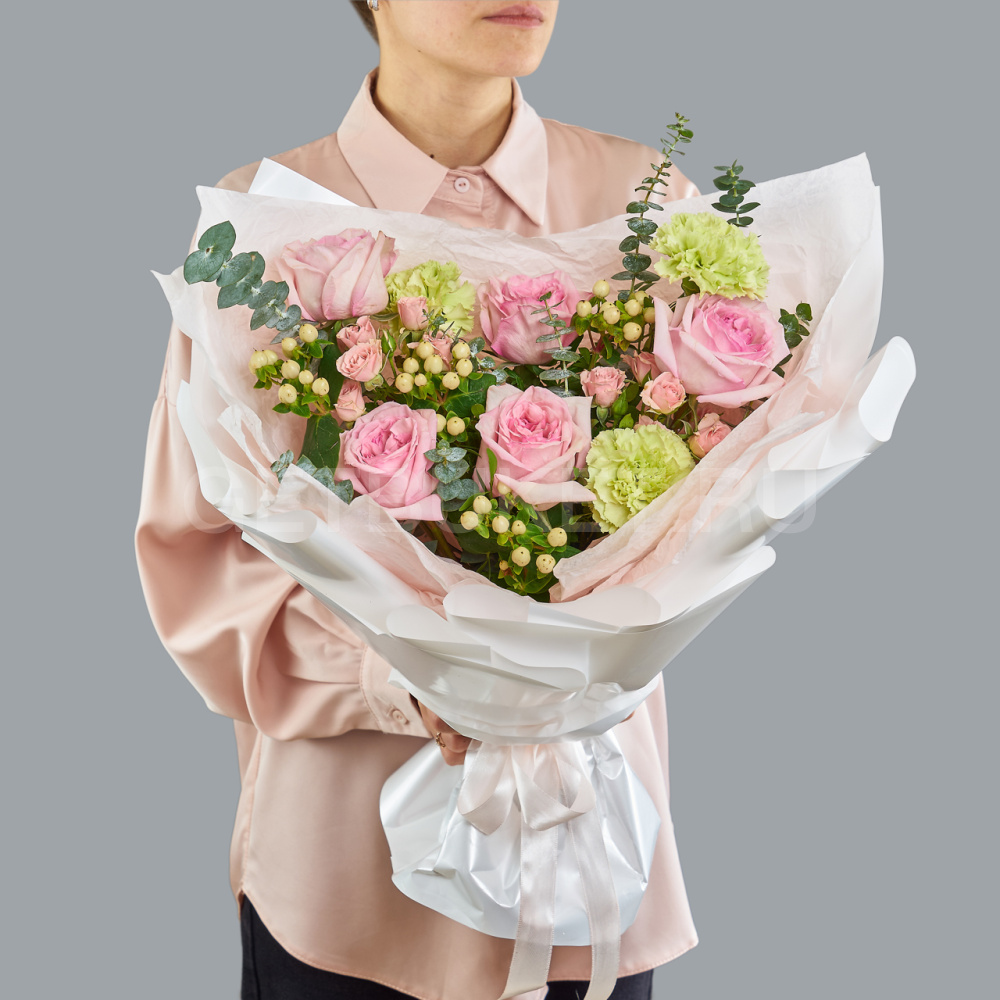 Букет зеленых гвоздик, розовых роз и гиперикума