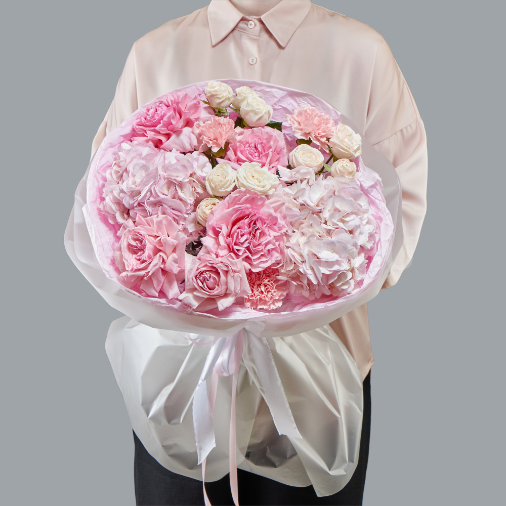 Розовый букет гортензий и роз с гвоздикой