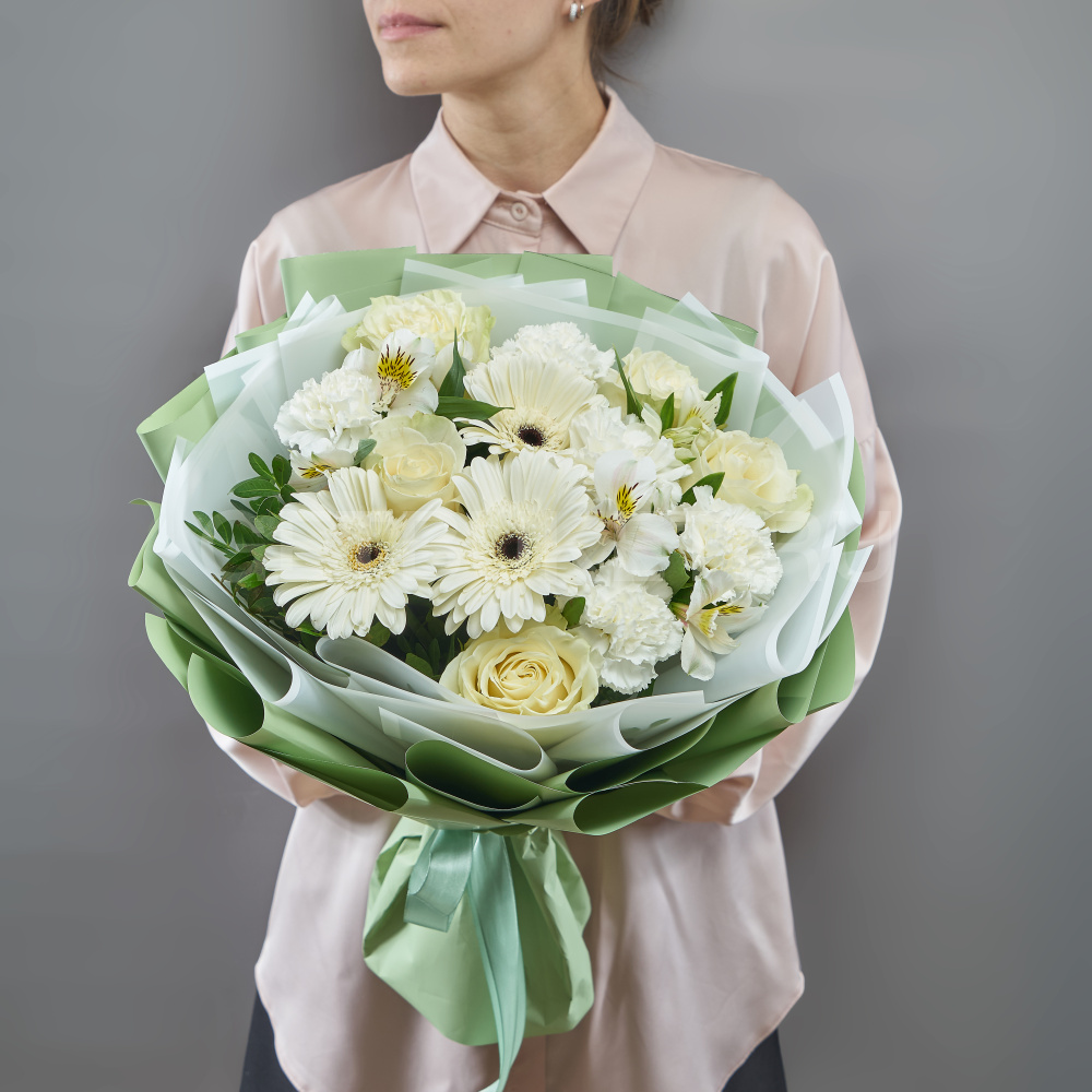 Букет из белых роз, кустовой хризантемы и альстромерии с эвкалиптом7 690 ₽Букет из белых роз, кустовой хризантемы и альстромерии с эвкалиптом 7 690 ₽ -