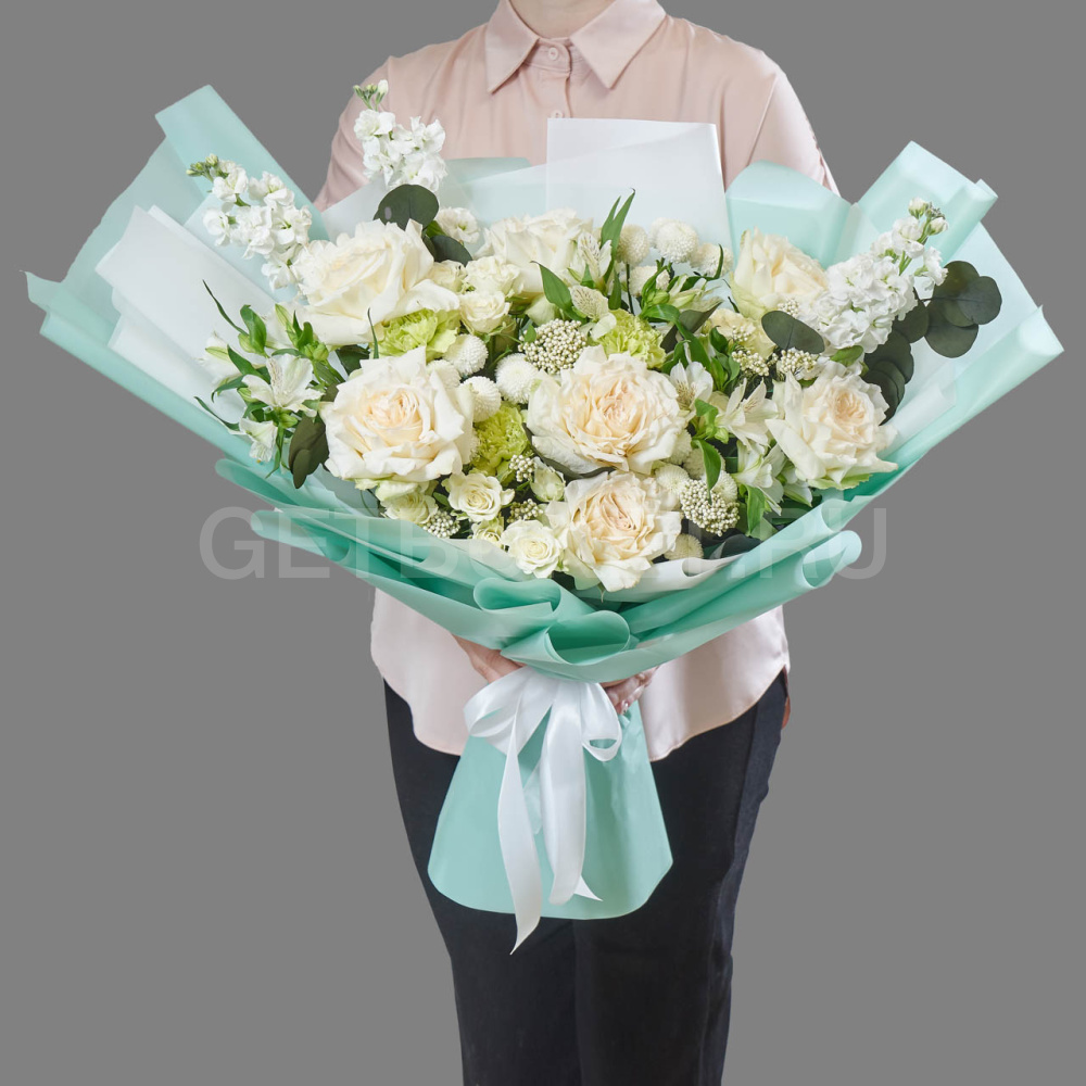 Букет из белых роз, кустовой хризантемы и альстромерии с эвкалиптом