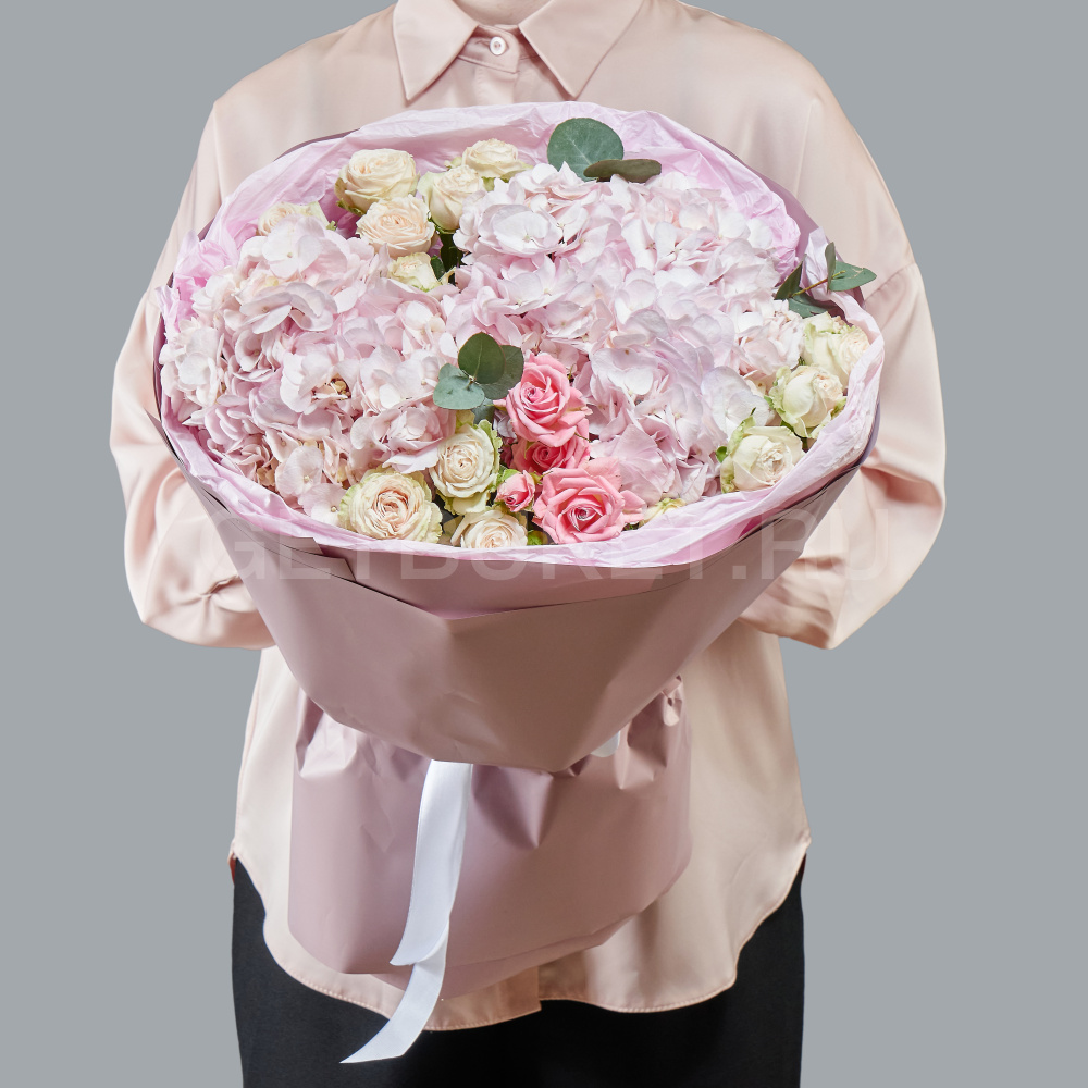 Букет розовых гортензий и кустовых роз