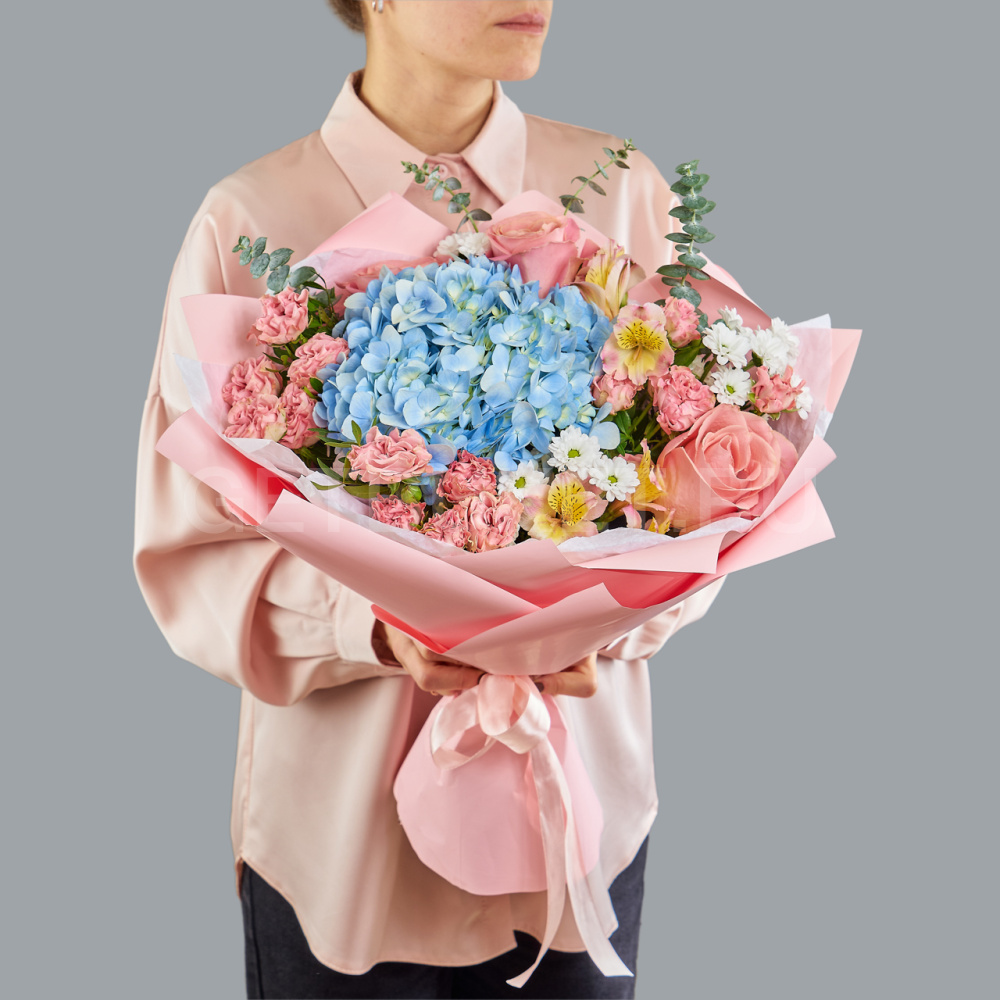 Букет из микса розовых цветов, голубой гортензии с белой хризантемой