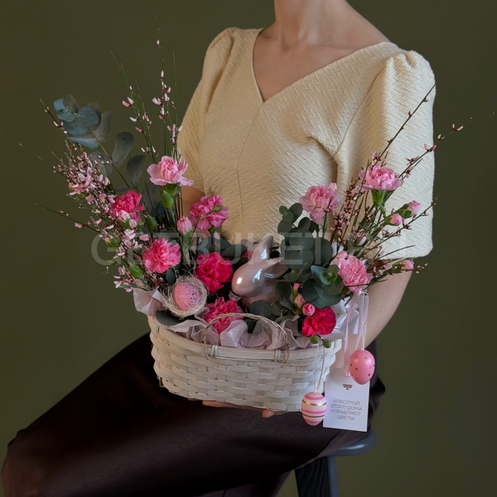 Цветочная композиция с гвоздиками, нарциссами и вербой в плетеной корзине3 900 ₽Цветочная композиция с гвоздиками, нарциссами и вербой в плетеной корзине 3 900 ₽ -