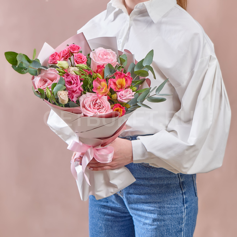 Букет из розовых эустом, кустовых роз и альстромерий