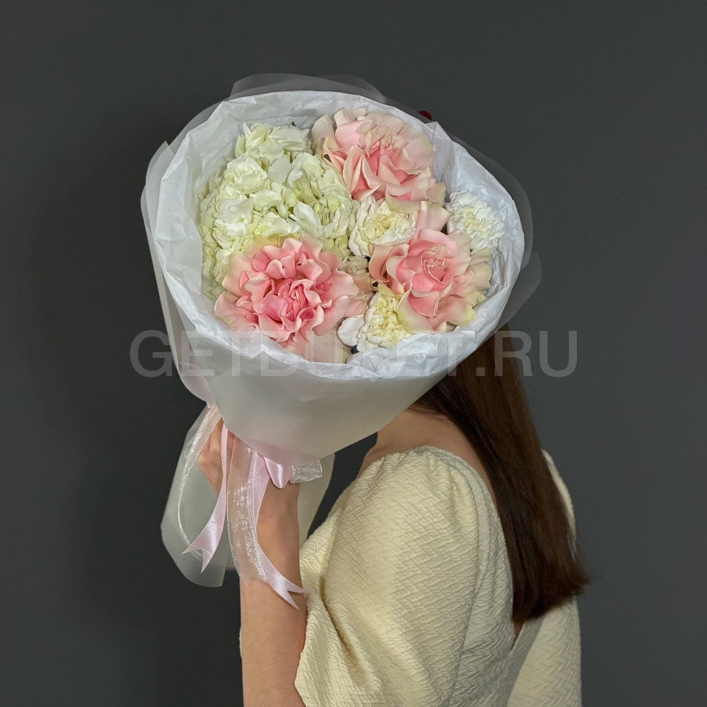 Букет из белой гортензии с розами и гвоздикой