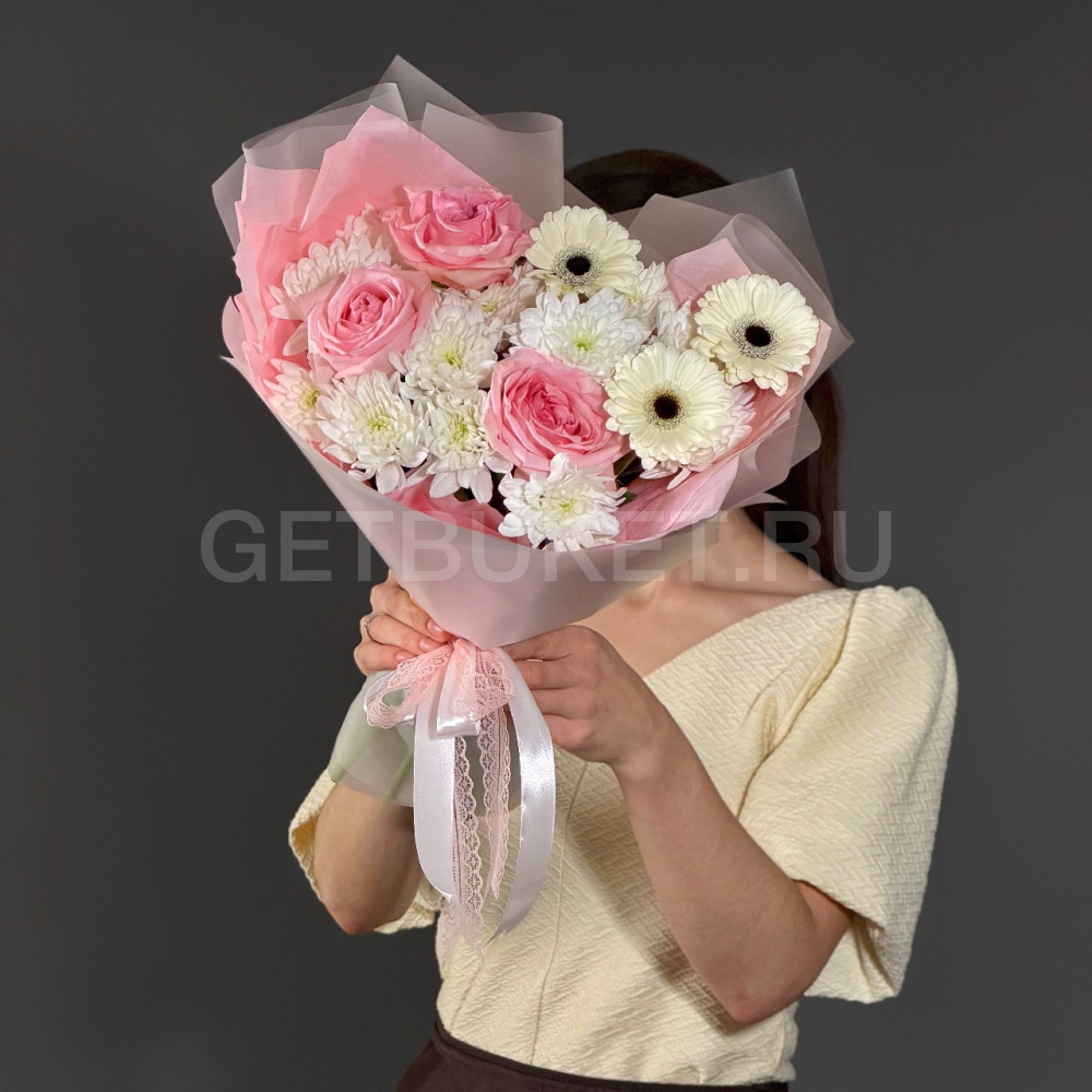 Букет из розовых роз, хризантем и гербер